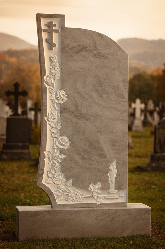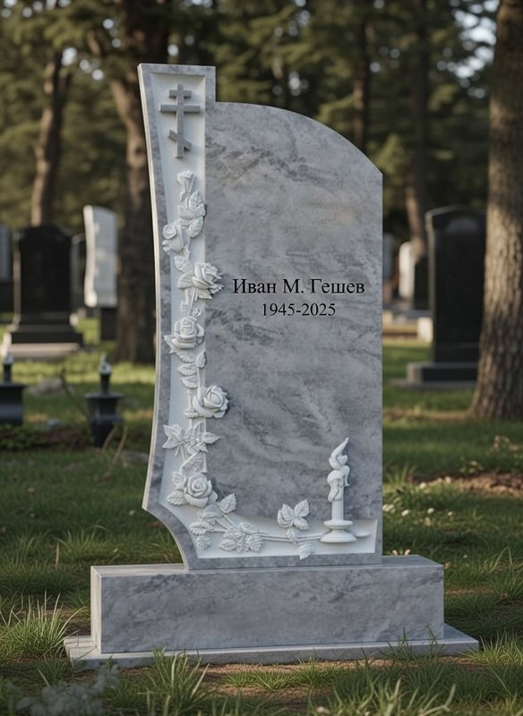 Елегантен надгробен паметник от естествен сив мрамор, изработен с внимание към детайла и уважение към паметта на близкия човек. Дизайнът включва красиви гравирани рози и православен кръст – символи на любов, вяра и вечен спомен.