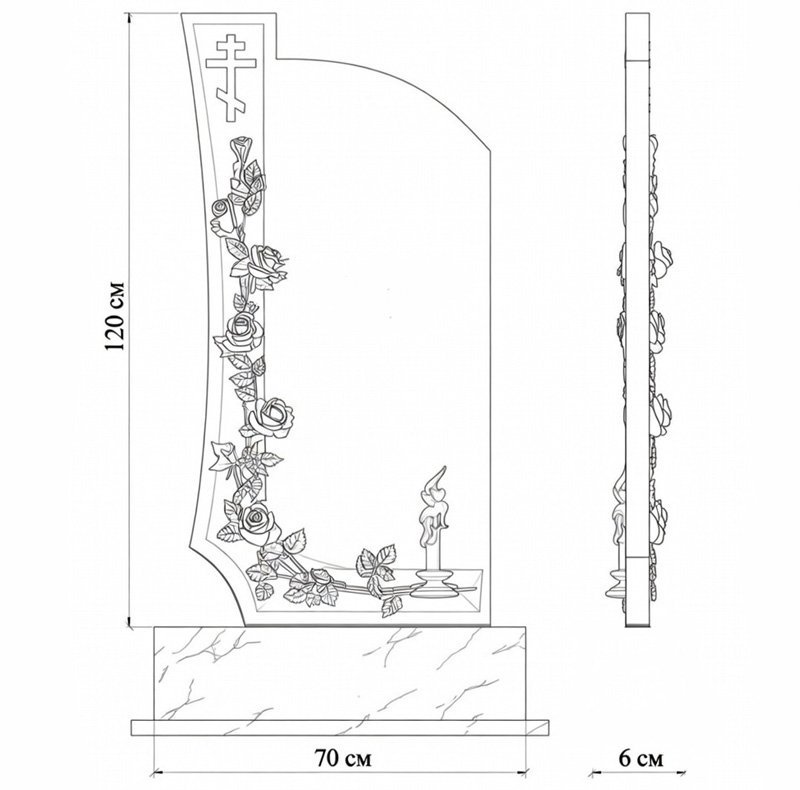 Размери: 120 × 70 см, подходящ за стандартни гробни места и мемориални пространства. Мраморът е внимателно обработен за дълготрайност и устойчивост на външни атмосферни условия, а гравирането се изпълнява с професионална техника за ясен и дълбок контраст.