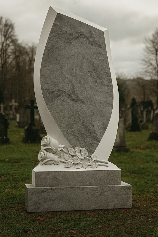Елегантен надгробен паметник, изработен от висококачествен сив мрамор Мура, отличаващ се с фина текстура, естествена визия и изчистен модерен дизайн. Формата на паметника е стилно извита, което придава усещане за лекота, достойнство и съвременна естетика.