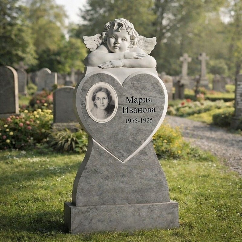Надгробен паметник с ангел и сърце от сив мрамор – символ на вечна любов и закрила