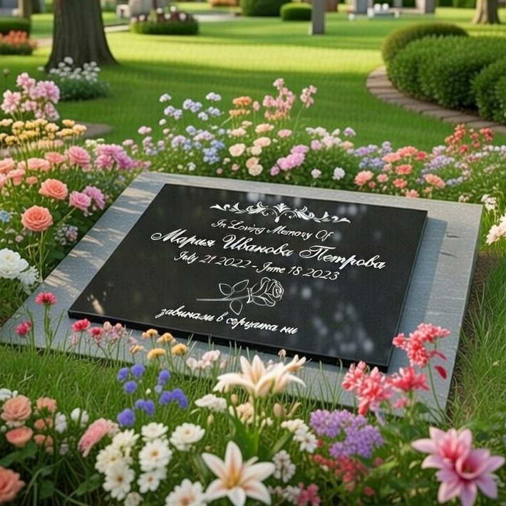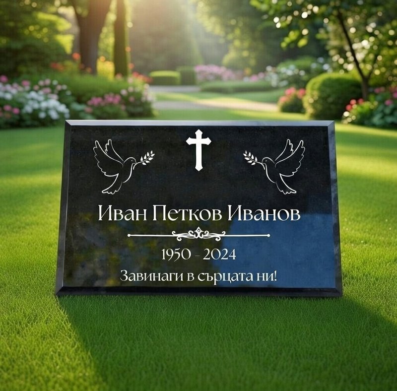 Надгробна плоча от черен гранит с дебелина 2 см, подходяща за урнови стени, добавка към съществуващ паметник или самостоятелен мемориал. Висококачествено гравиране, персонализация с име, дати и символи.