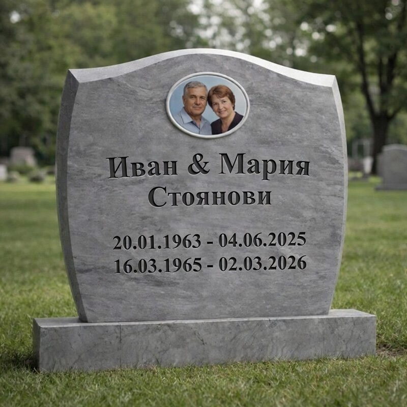 Семеен надгробен паметник от естествен сив мрамор, изработен с внимание към детайла и дълбоко уважение към паметта на поколенията. Моделът включва керамична снимка с висока издръжливост, както и възможност за гравиране на няколко имена, години и лично послание, подредени в балансирана и естетична композиция.